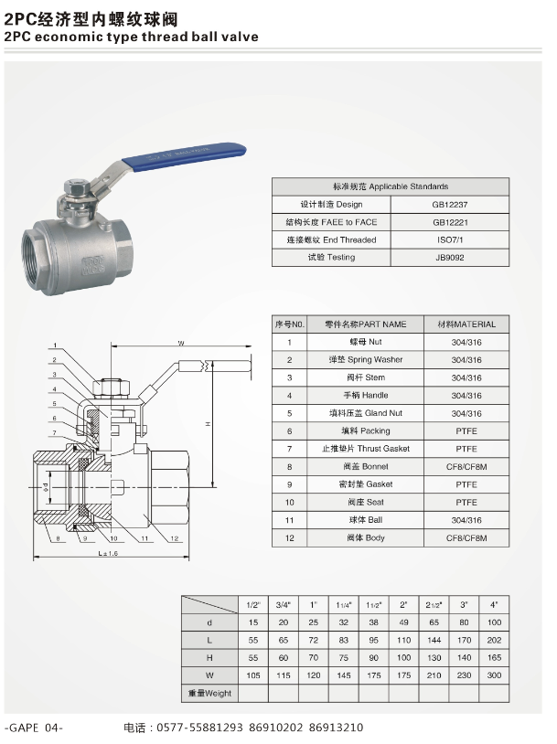 產(chǎn)品名稱(chēng):二片式不銹鋼內(nèi)螺紋球閥